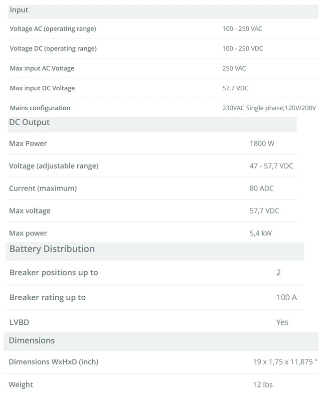 | Output Voltage | 47 - 57.7 VDC |